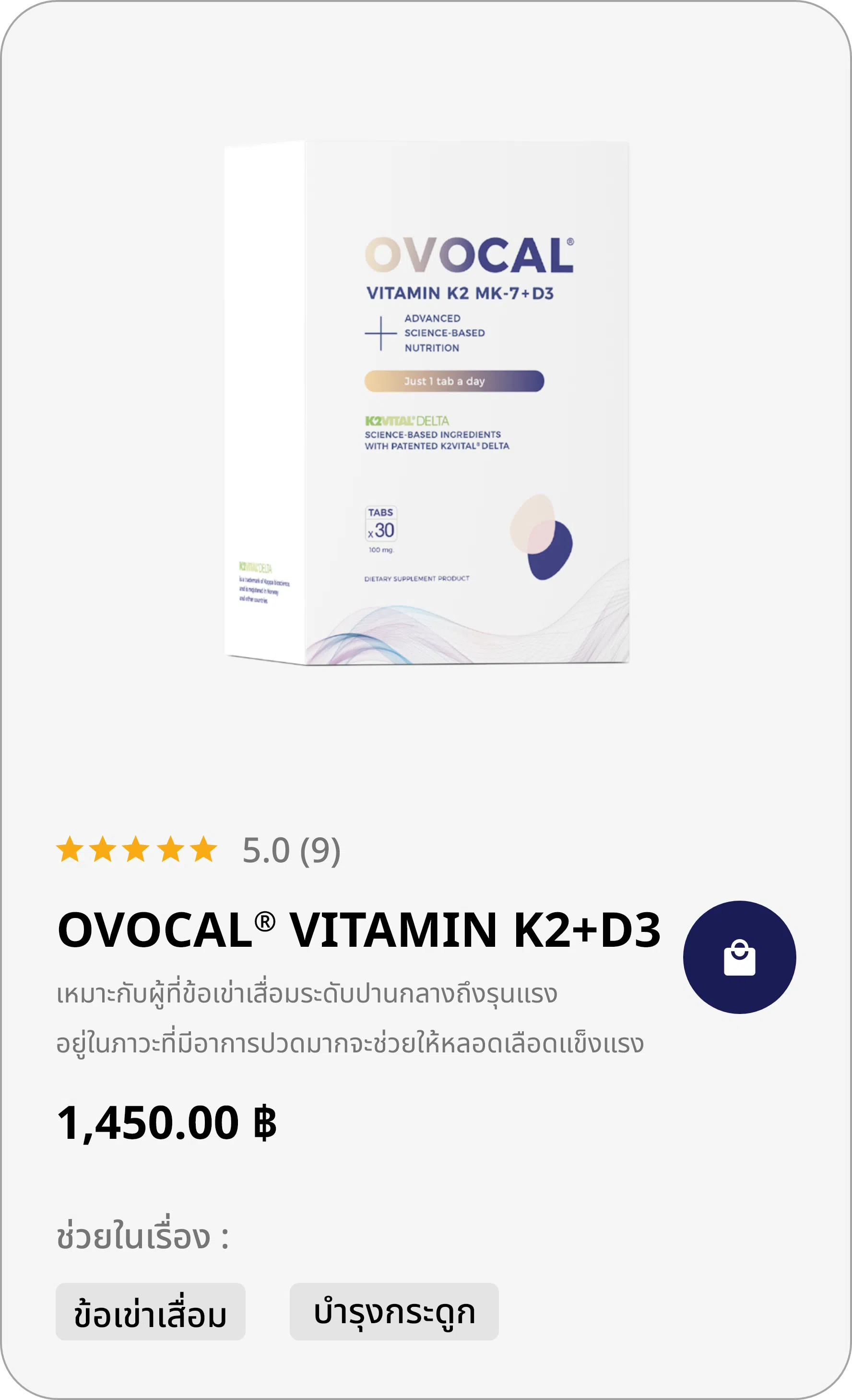 แสดงว่าเริ่มมีอาการที่เกิดจากผิวข้อเข่าเสียดสีจนเกิดความขรุขระ จึงเริ่มมีเสียงในบางท่าของการเคลื่อนไหว การรับประทาน OVOCAL จะไปช่วยเพิ่มน้ำเลี้ยงข้อเข่า ทำให้การเสียดสีดังกล่าวลดลง เสียงก๊อบแก๊บจึงจะลดลงไปด้วย